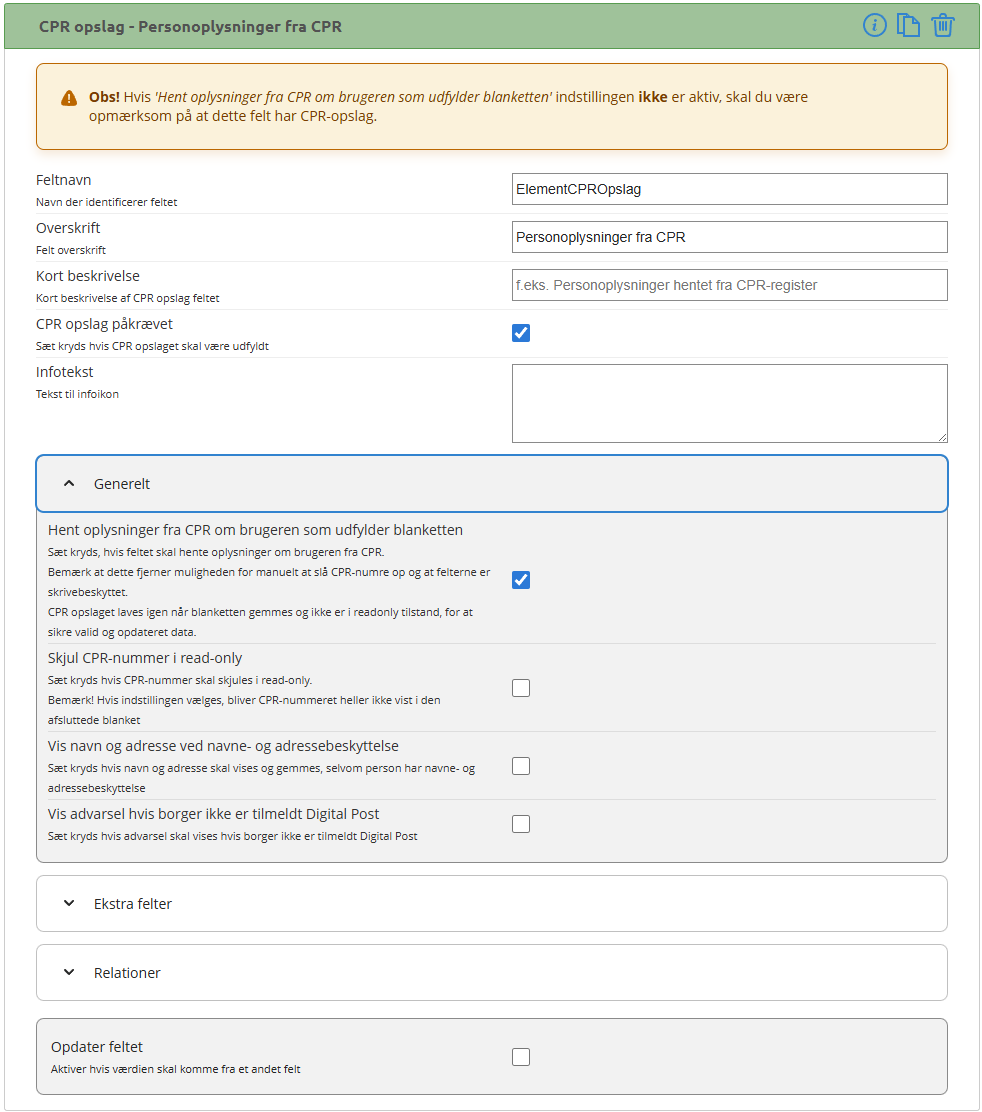 for opsætningen af Personoplysninger fra CPR-feltet