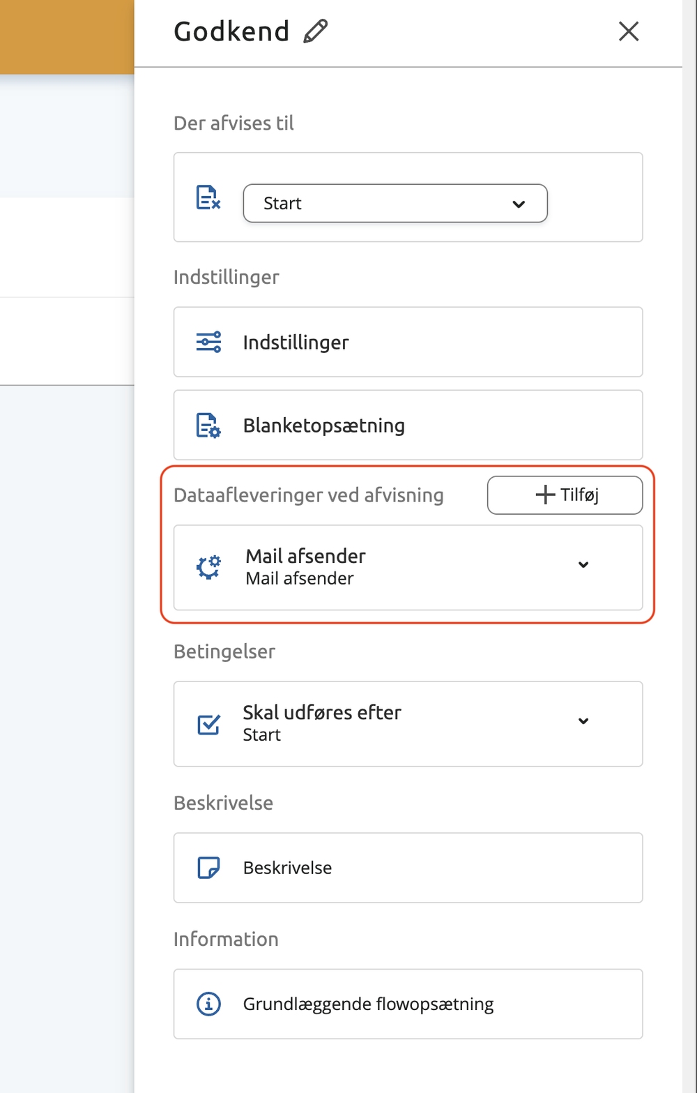 Du kan ydermere opsætte en dataaflevering, som aktiveres, hvis en blanket afvises i en Godkend-aktivitet.