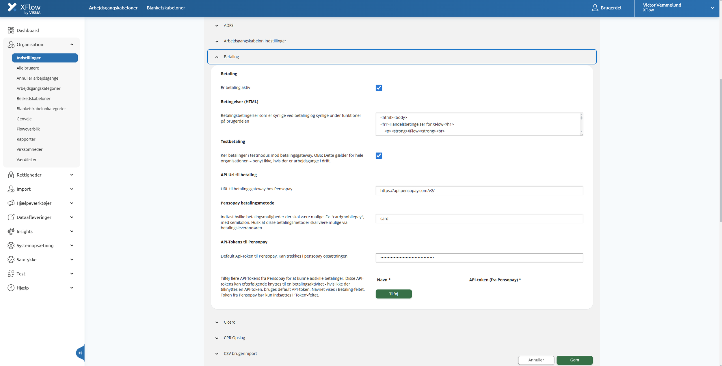 API-Token til Pensopay: Indtast det API-Token, du har fået fra Pensopay. Dette token er nødvendigt for at autentificere kommunikationen mellem XFlow og Pensopay.