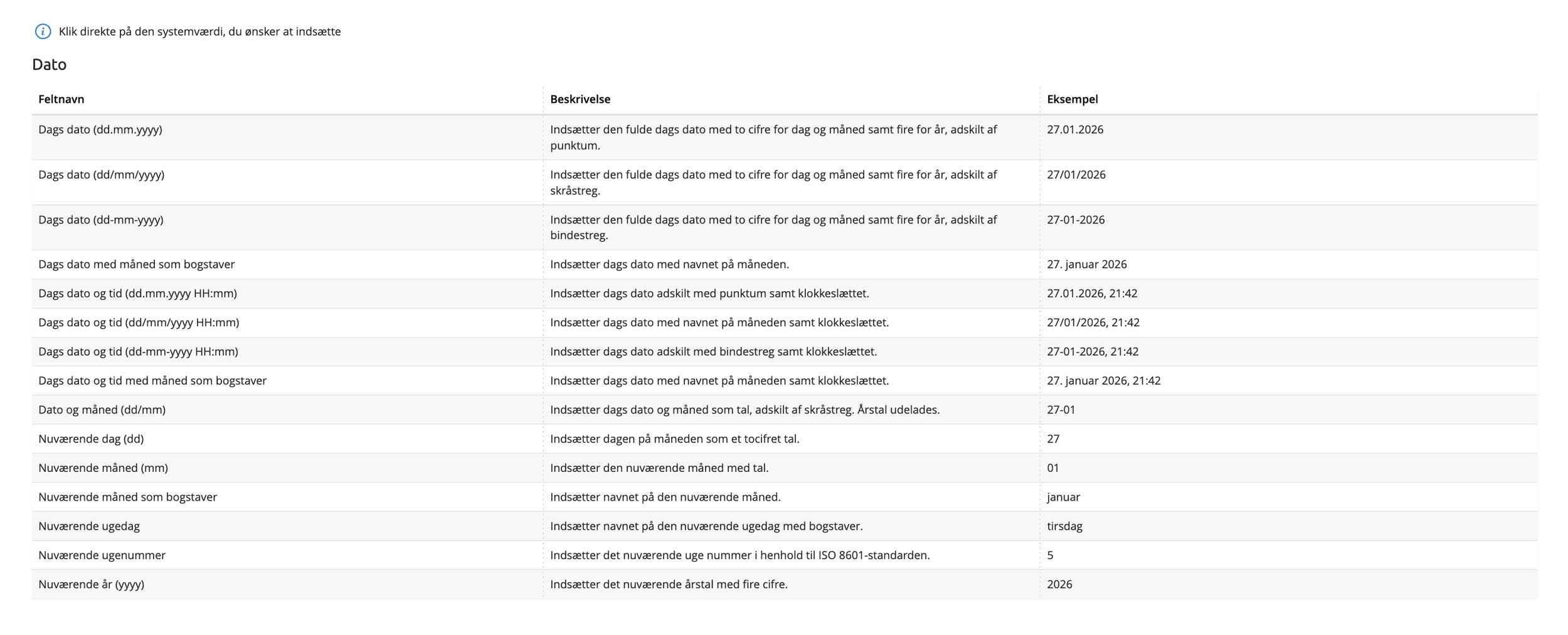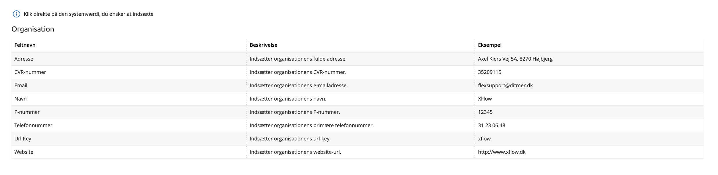 Der er tilføjet systemværdier, som automatisk henter oplysninger fra organisationens indstillinger, fx: