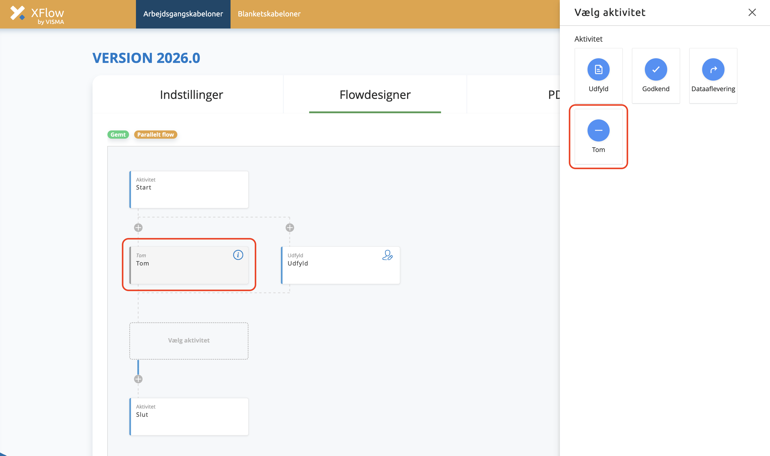 En tom aktivitet kan anvendes i parallelle flows, dvs. aktiviteten er kun tilgængelig, når parallelt flow er slået til.