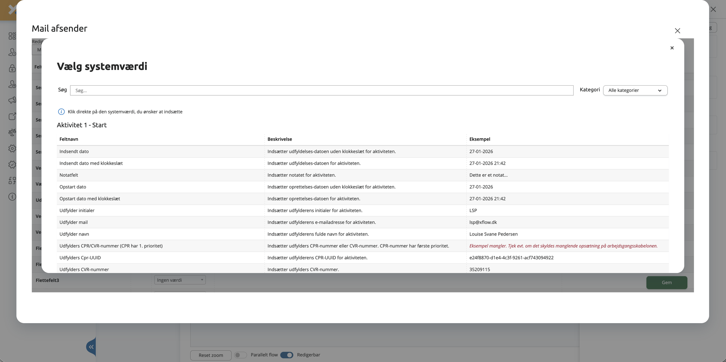 I dataafleveringer, hvor du arbejder med flettefelter og anvender systemværdier, kan du nu enten vælge systemværdierne direkte fra dropdown’en, som hidtil, eller klikke på “Vælg fra overblik”. Når du vælger “Vælg fra overblik”, åbnes et vindue med et samlet overblik over alle tilgængelige systemværdier, hvor du: