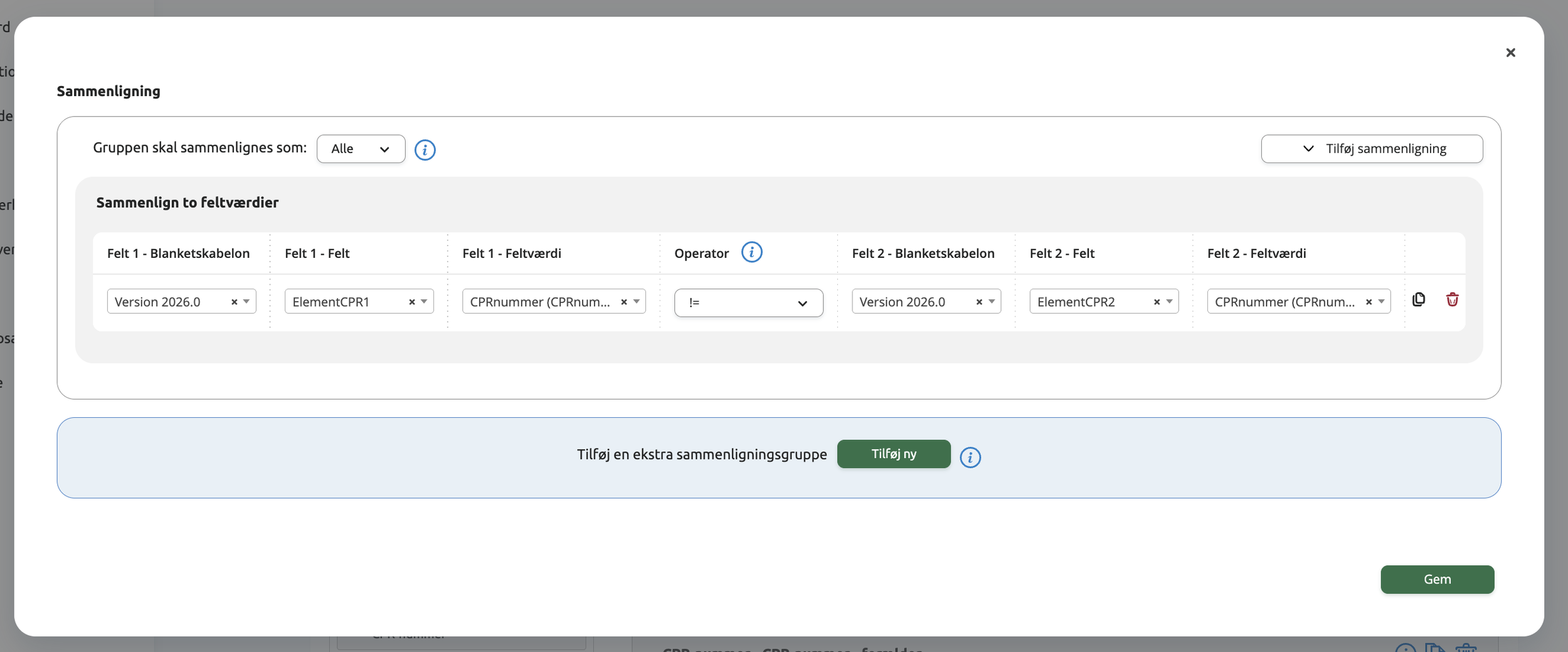 For at undgå fejlindtastninger, fx at en forælder skriver sit eget CPR-nummer i stedet for barnets, eller at to e-mailadresser ikke matcher, er sammenligningsfeltet udvidet med en ny mulighed: “Sammenlign to feltværdier”.