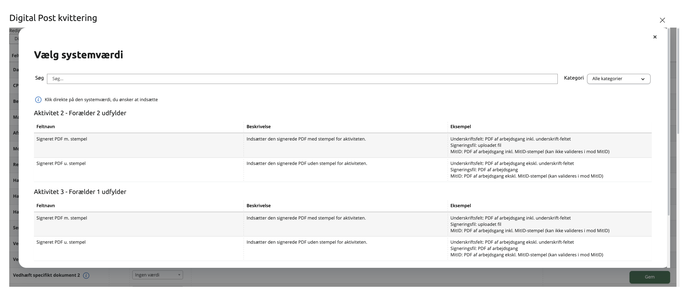 Som en ekstra hjælp har vi også udvidet systemværdi-overblikket, som vi lancerede i version 2026.0, så det nu også er tilgængeligt for Dokumenter og Liste af dokumenter. Det gør det nemmere at få overblik over, hvilke systemværdier du kan bruge, når du arbejder med signeringsdokumenter og andre filer i dine dataafleveringer.