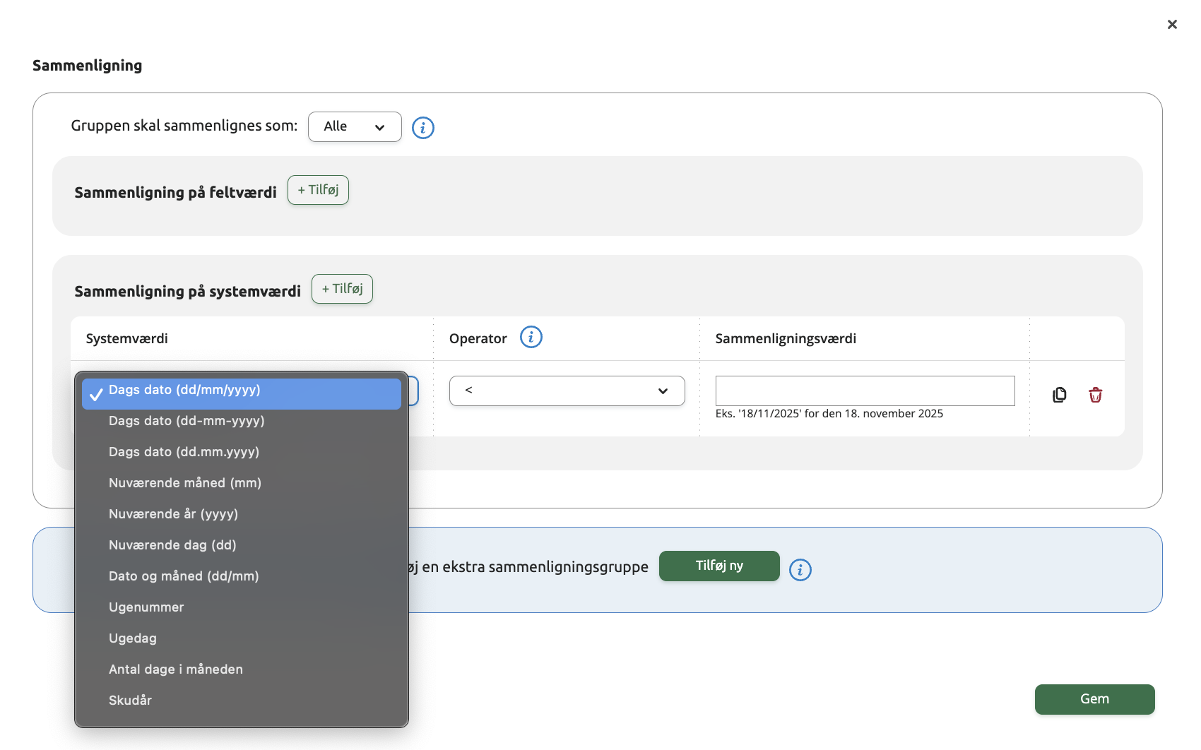 Når du vælger en systemværdi, vises der automatisk et eksempel på det format, du skal skrive din sammenligningsværdi i.