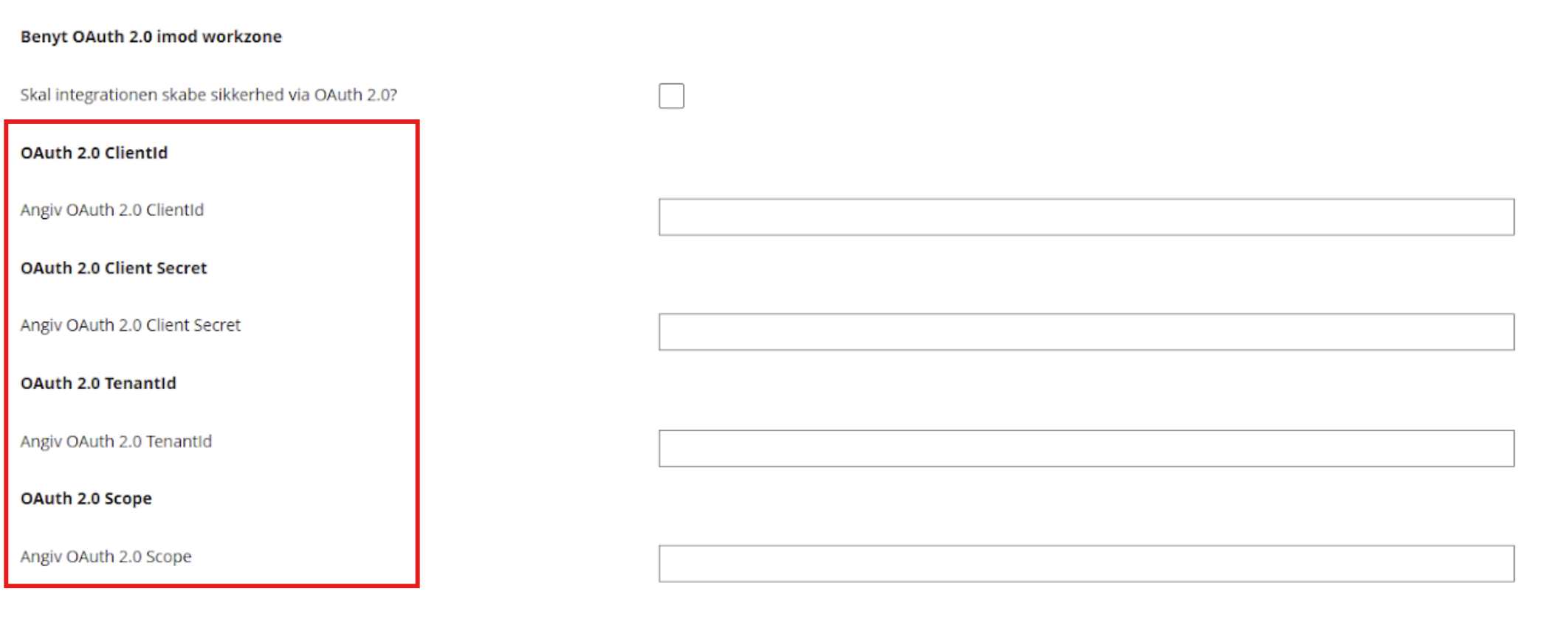 Denne anvendes typisk til servicebrugere for at øge sikkerheden. Man kan ikke logge ind nogle steder med en Servicebruger. Følgende felter er påkrævede ved brug af OAuth 2.0: