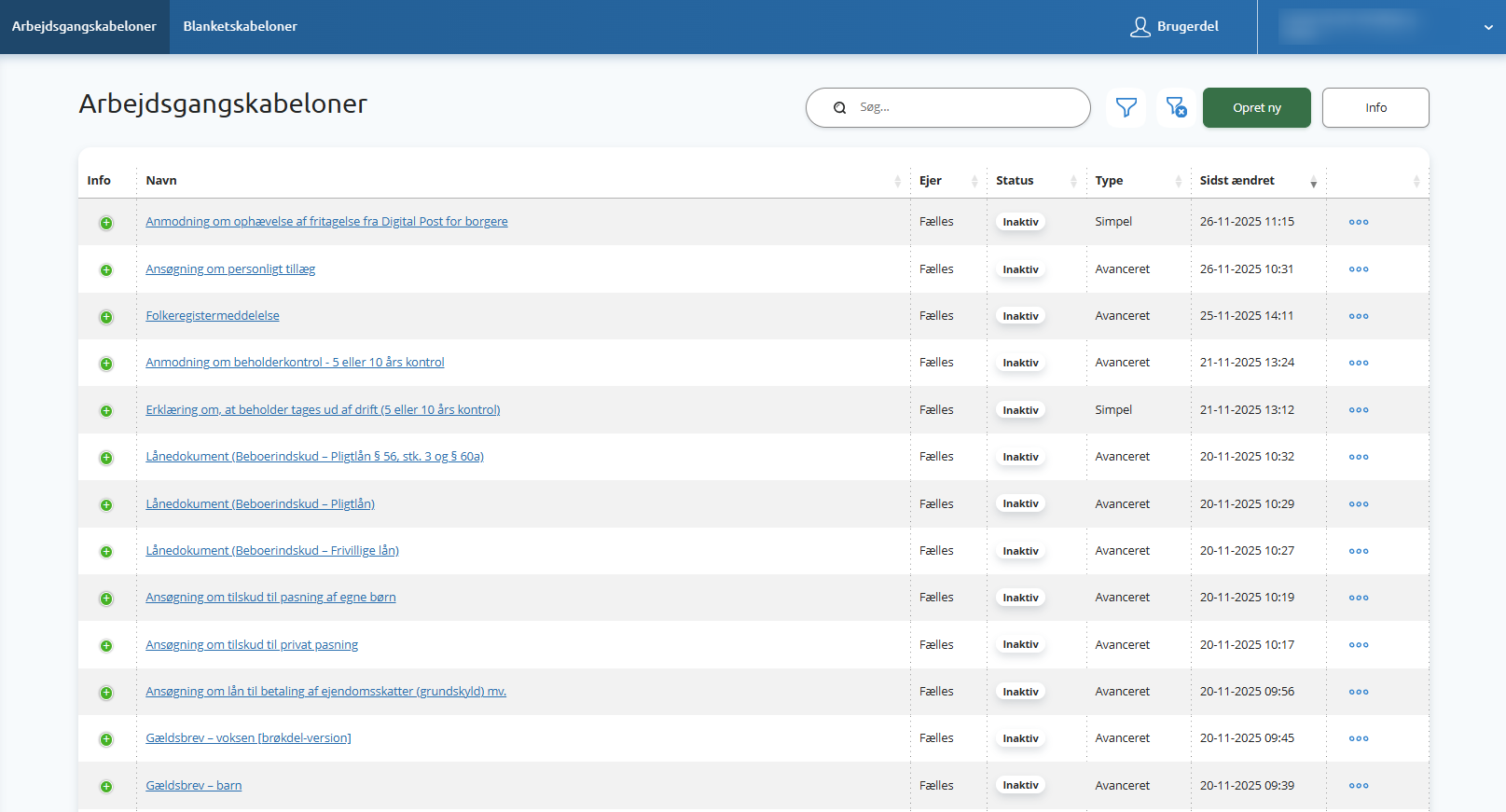 Fra administrationssiden går man til “Arbejdsgangskabeloner”. Her vil alle de KL blanketter, som allerede er oprettet, fremgå.