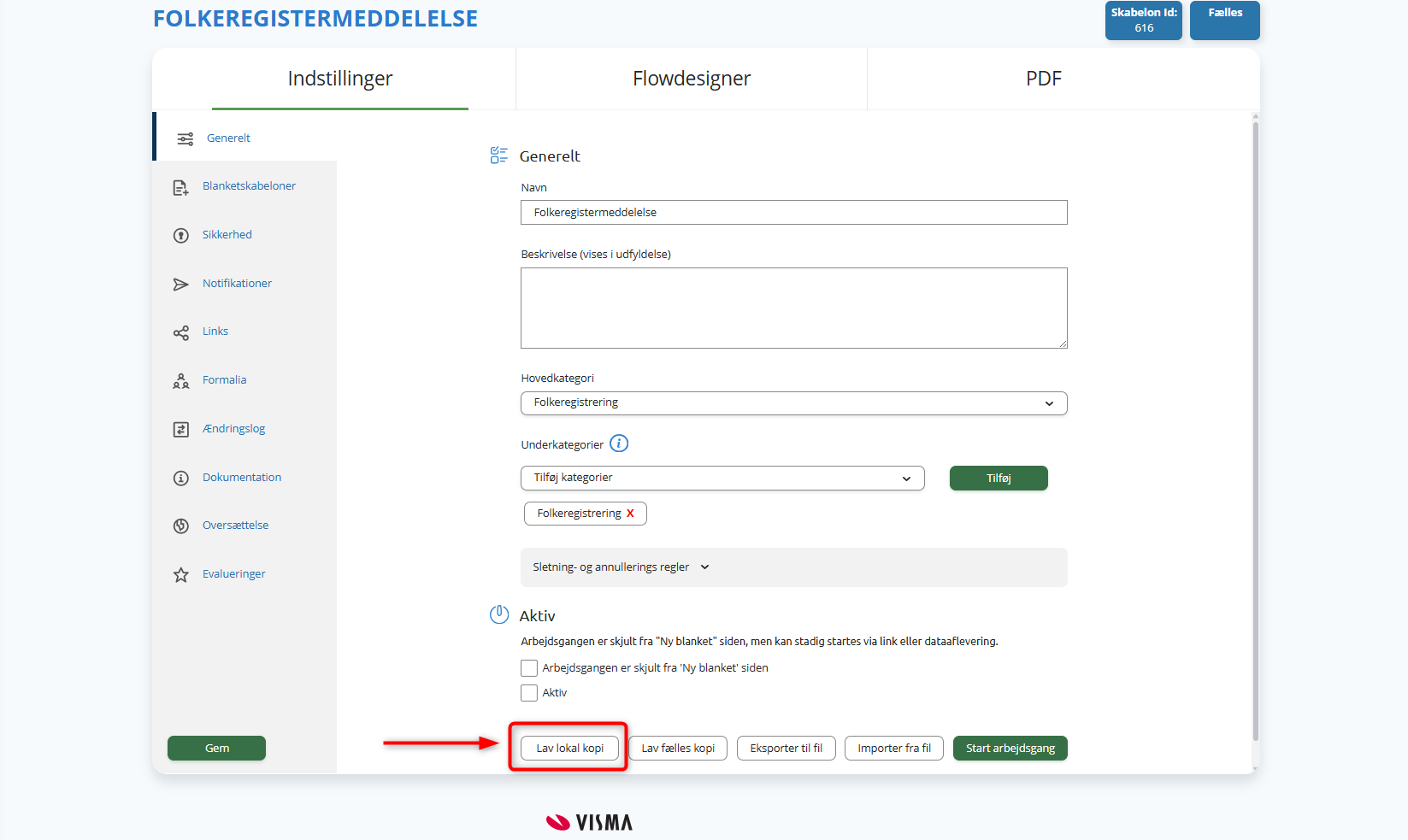 Indholdet af blanketten samt eventuelt lovgrundlag vil automatisk blive taget med i den lokale variant. Det samme gælder de aktiviteter, dataafleveringer, kvitteringer, mv. som er opsat i flowdesigneren.